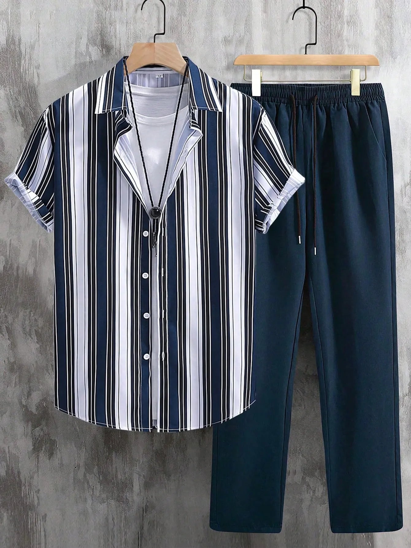 Refined yet relaxed, this Korean-style co-ord set is a go-to choice for smart casual dressing. The shirt features vertical navy, white, and black stripes that elongate your frame while offering a clean, modern aesthetic. Crafted from soft, breathable cotton, it pairs seamlessly with the solid navy trousers designed for all-day comfort and a polished look.