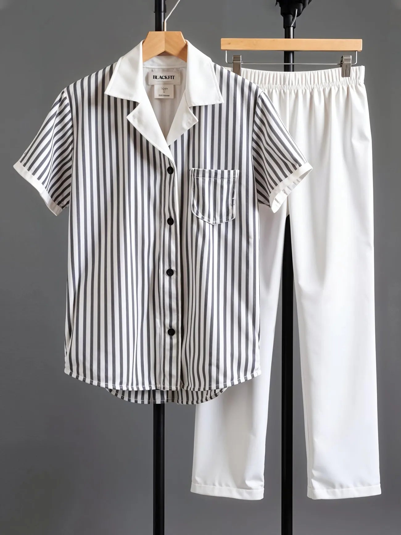 Elevate your casual wardrobe with this Korean-style co-ord set, designed for the modern man who values clean lines and timeless style. The shirt features bold vertical stripes in black and white, complemented by a contrasting solid collar and pocket detailing. Crafted from soft, breathable cotton, it pairs effortlessly with the tailored white trousers for a look that’s polished yet relaxed.